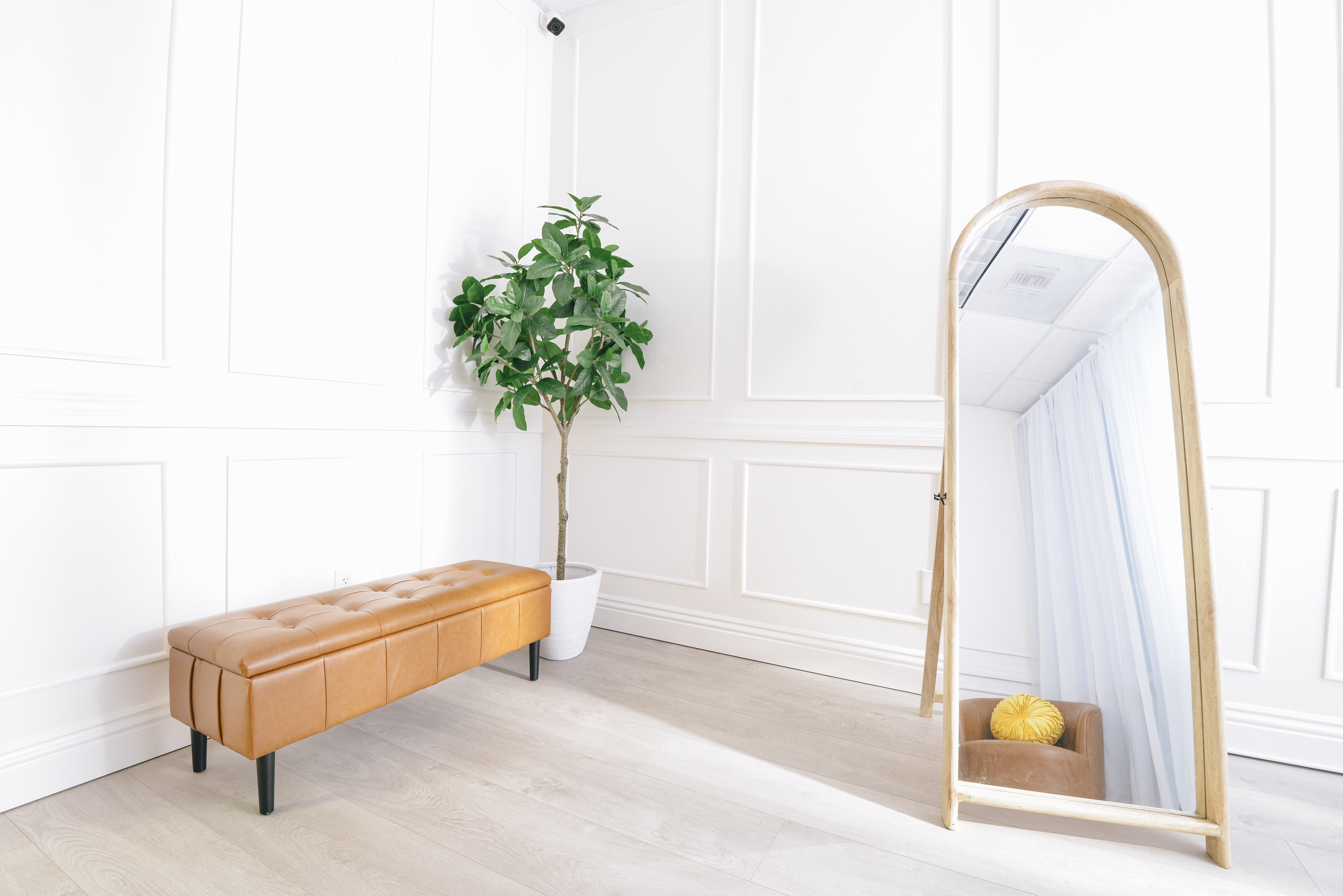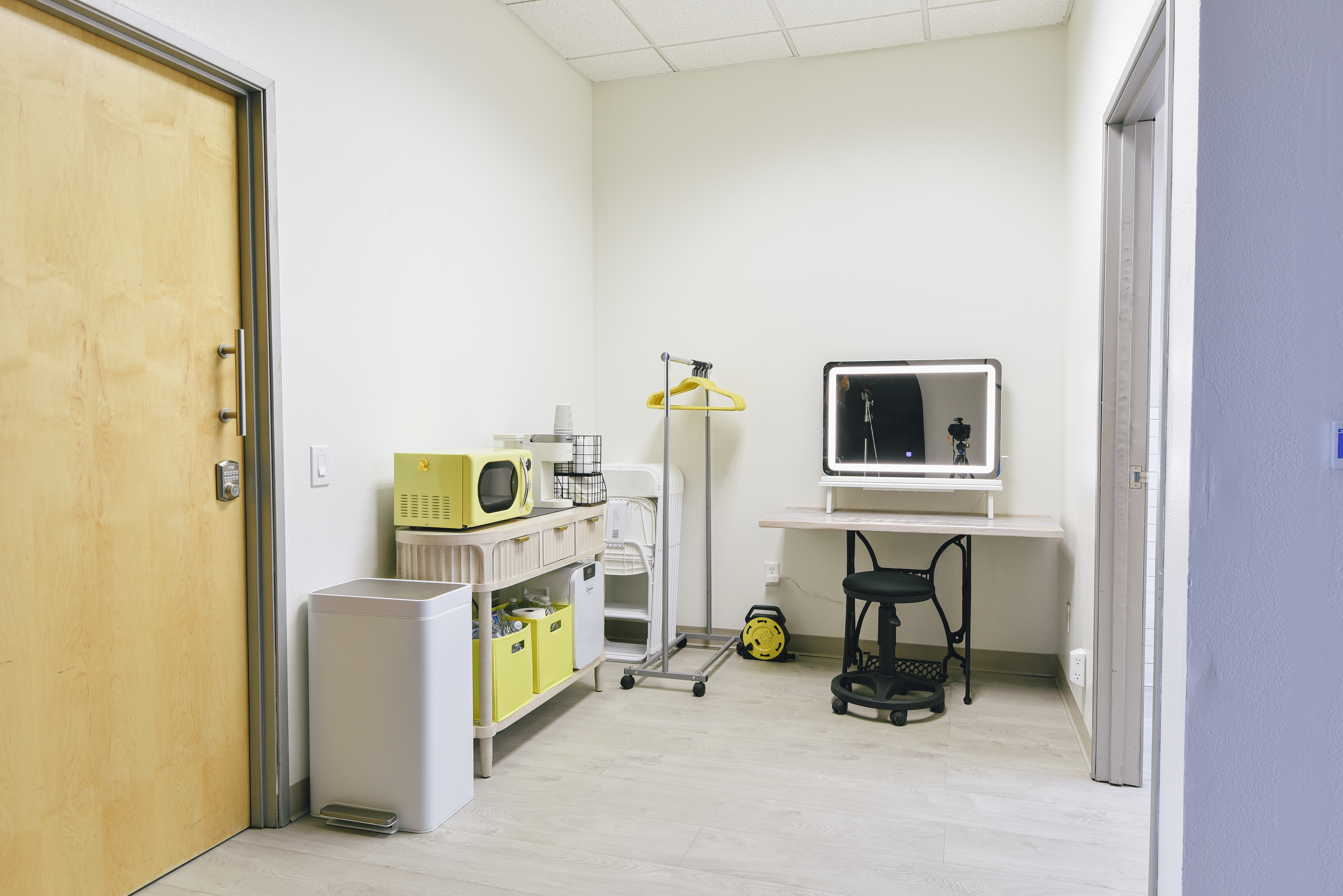 Our studio at Lemon Squeeze is the perfect playground for photographers and content creators alike. Located on the Murrieta / Temecula border, this unit is best for photo and video productions with crews of under 5 people. There's a southern facing window with morning light and a curtain for a dreamy look, and the ability to run two sets with two backdrops at the same time. There is also an area for hair and makeup artists to get prepared in and an attached bathroom.